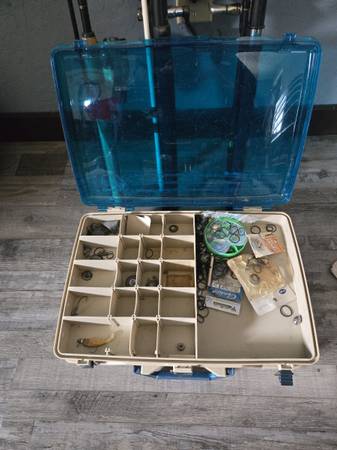 3 different fishing rods with reels tackle box. Now days I mostly fishing in Costco.