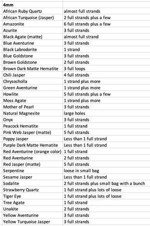 Full strands, partial strands, loose beads for jewelry making, sun catchers or crafts Organized in plastic bags, labeled with type of gemstone: ~ 4mm – 34 different types ~ 6mm – 18 different types...